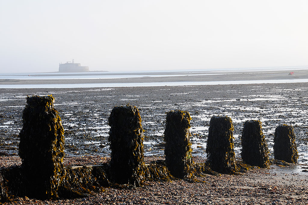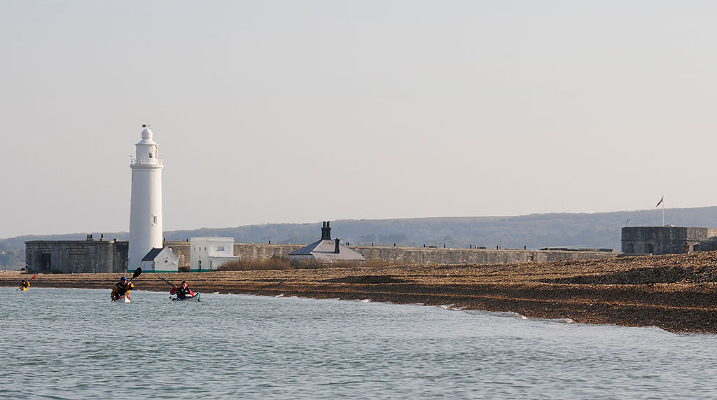 | Hurst Castle and lighthouse as we approach the gravel spit before entering Keyhaven |