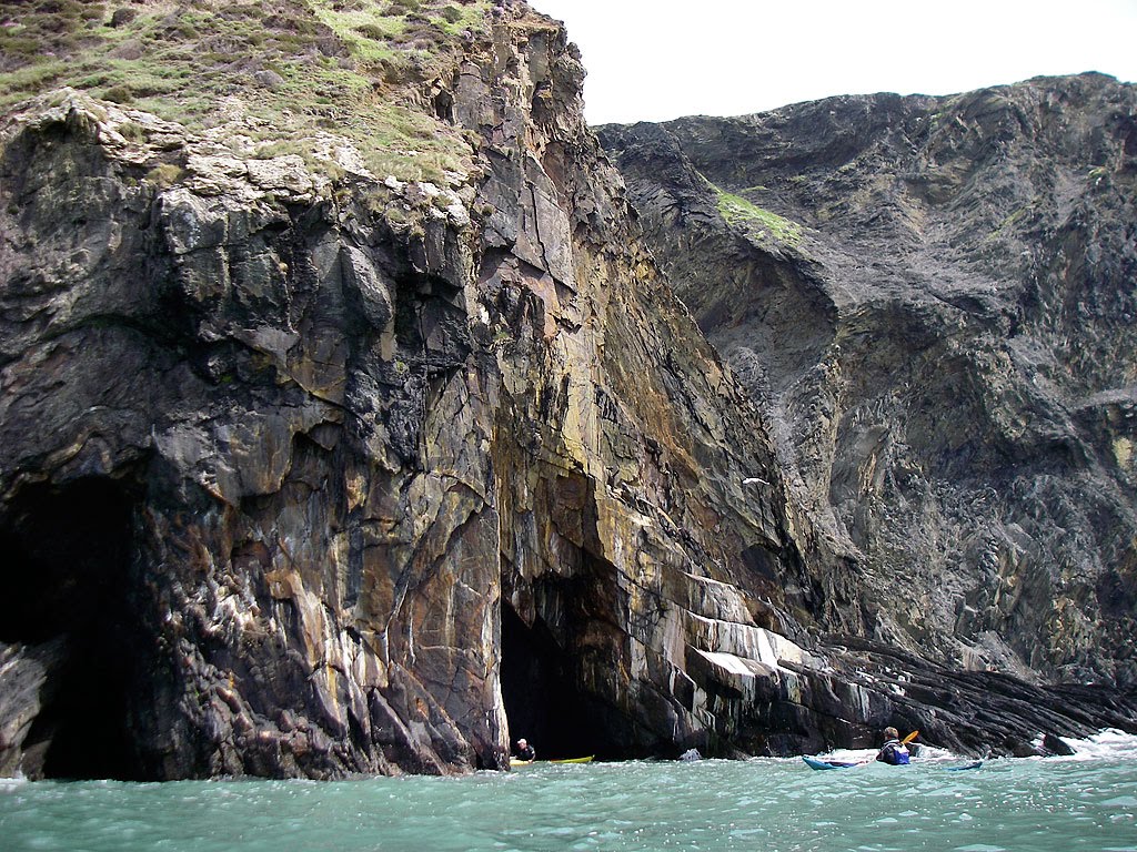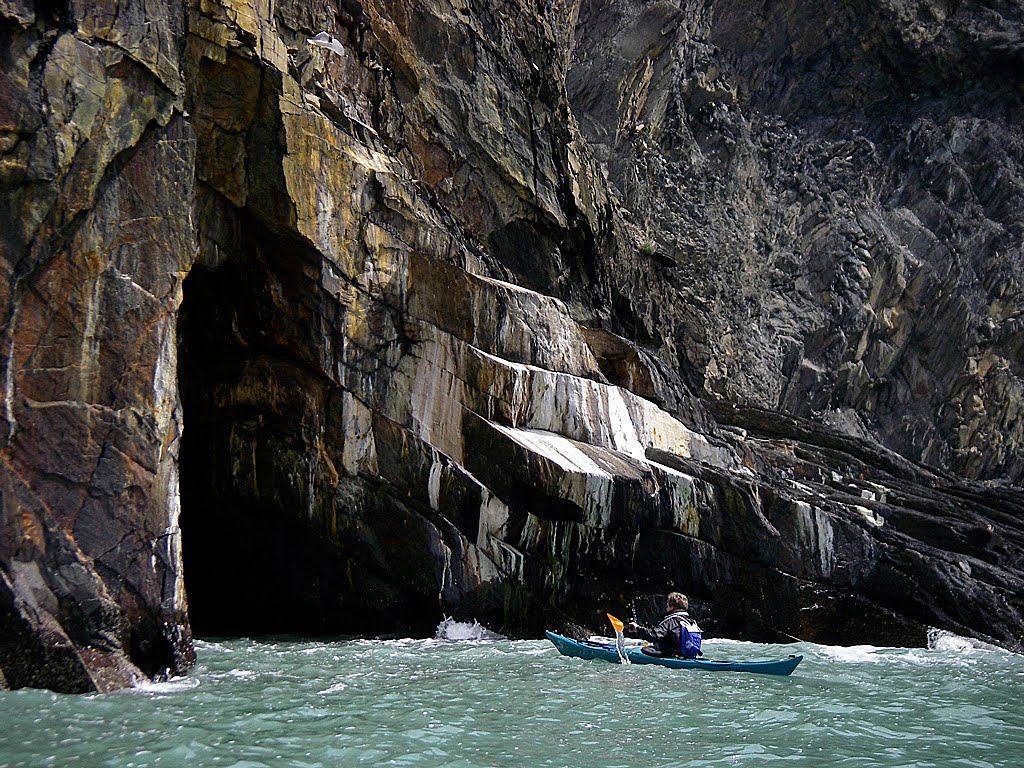 The swell and wind had picked up quite quickly. Stopped to take a few photos and to start to look for the entrance to the cauldron, before I knew it I was a fair way behind the group, so aborted the cauldron seek to do a bit of catch up. Hywel, Adrian and Steve had continued on to get around Cemaes Head for some shelter.