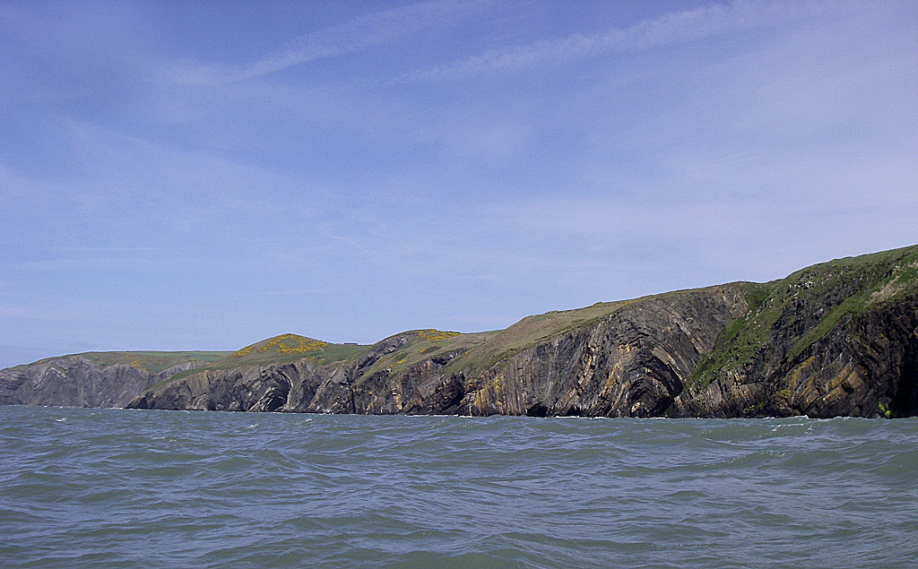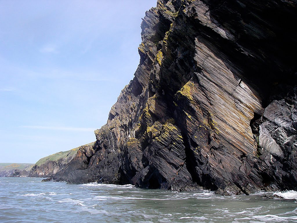 Towering cliffs, in places over 150m in height, lined the coastline. They have fantastic cross sectional patterns. The wavy strata looks to have been buckled under great forces of some other time.