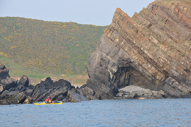 It is a great bit of coast line to have fun rock hopping amongst the pronounced reefs. Reaching the race under Hartland Point lighthouse we rounded the point to take a look at the giant teed up golf ball that is the radar station behind the lighthouse.