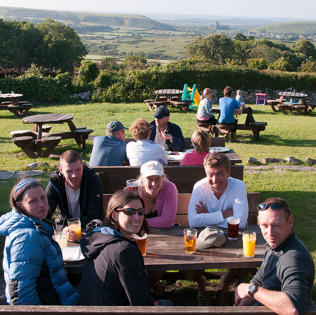 | Quenching our thirst overlooking Corfe Castle before the retreat home to Wales |