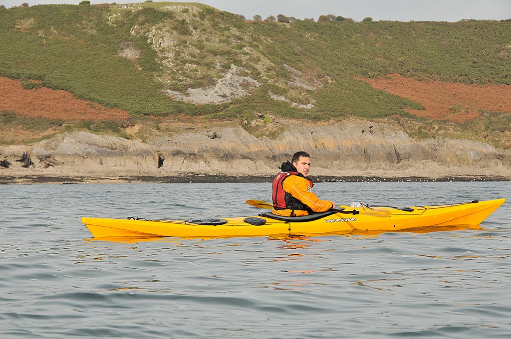 Morning sees myself, Claire, Mark, and Chris launch from Martin's Haven. I'm trying out a glass version of my trusty plastic Capella. Shiny and rigid, I quite like the feedback that the boats stiffness gives me.