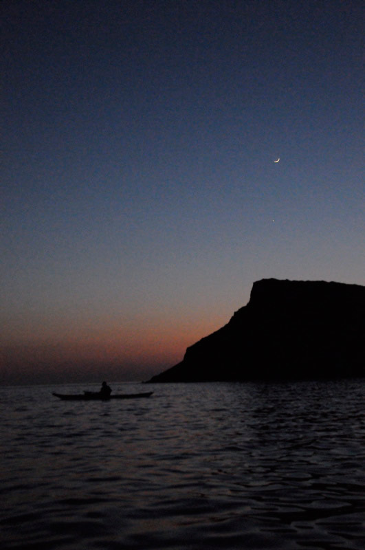 The sun put to bed, we turn to paddle back as the clear night sky turns dark and the stars begin to show themselves, the moon just about there. Out of this world.
