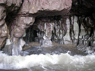 Tresilian Bay, with Reynard's Cave on the left (scene of the execution of pirate Colyn Dolphin). The tide not high enough yet to go and explore